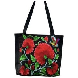 Product Details: Color: Multicolor, Red Flower & Butterfly XL Embroidered Bag, Closure Type: Zipper, Strap Type Shoulder bag, Cross body, 100% Polyester.