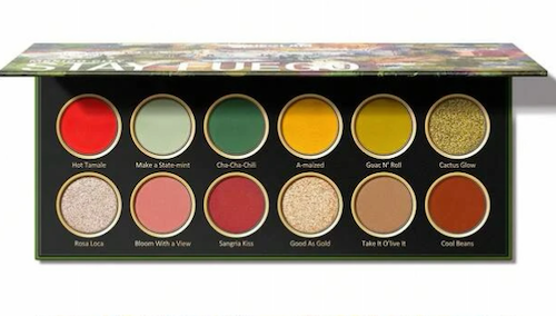 Palette 12 eyeshadow colors are: Hot Tamale: orange-red, Make a State-mint: pale mint green, Cha-Cha-Chili: forest green, A-maized: corn yellow, Guac N' Roll: pear green