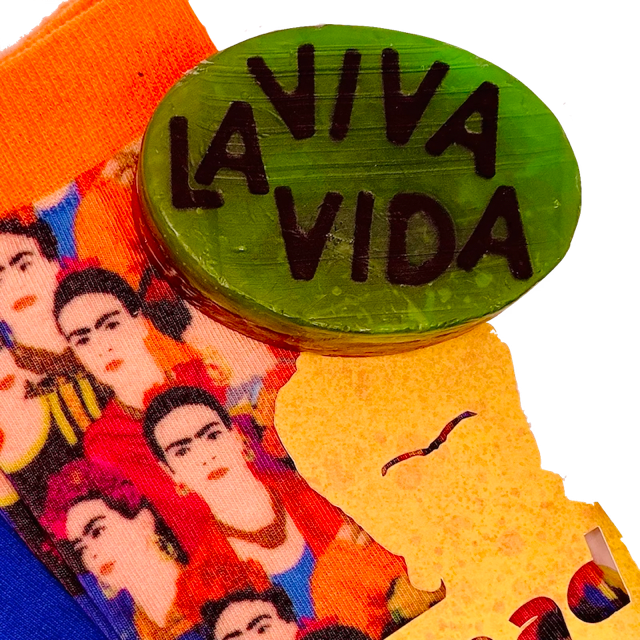 This soap is a representation of Frida's last known painting with the words painted "VIVA LA VIDA" before her death. Each letter is carefully laid by hand to complete design "VIVA LA VIDA" is a representation of her life. and it has both