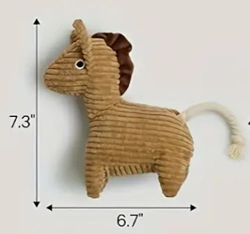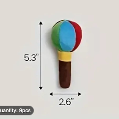 One piece in a clear plastic bag, each toy has an approximate measure check before selecting, contains a Squeaker inside, machine washable, hang dry, do not bleach.